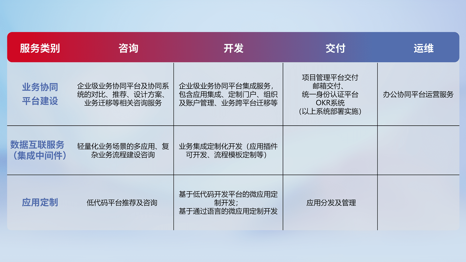 针对钉钉、、企微、、、IDaas等平台级产品提供产品的规划、、、方案、、、交付、、定制化开发等服务,,,实现如统一协同办公、、智能客户服务、、、、混合会议管理、、、智能数据查询、、等业务场景,,,实现数字化转型。。。。