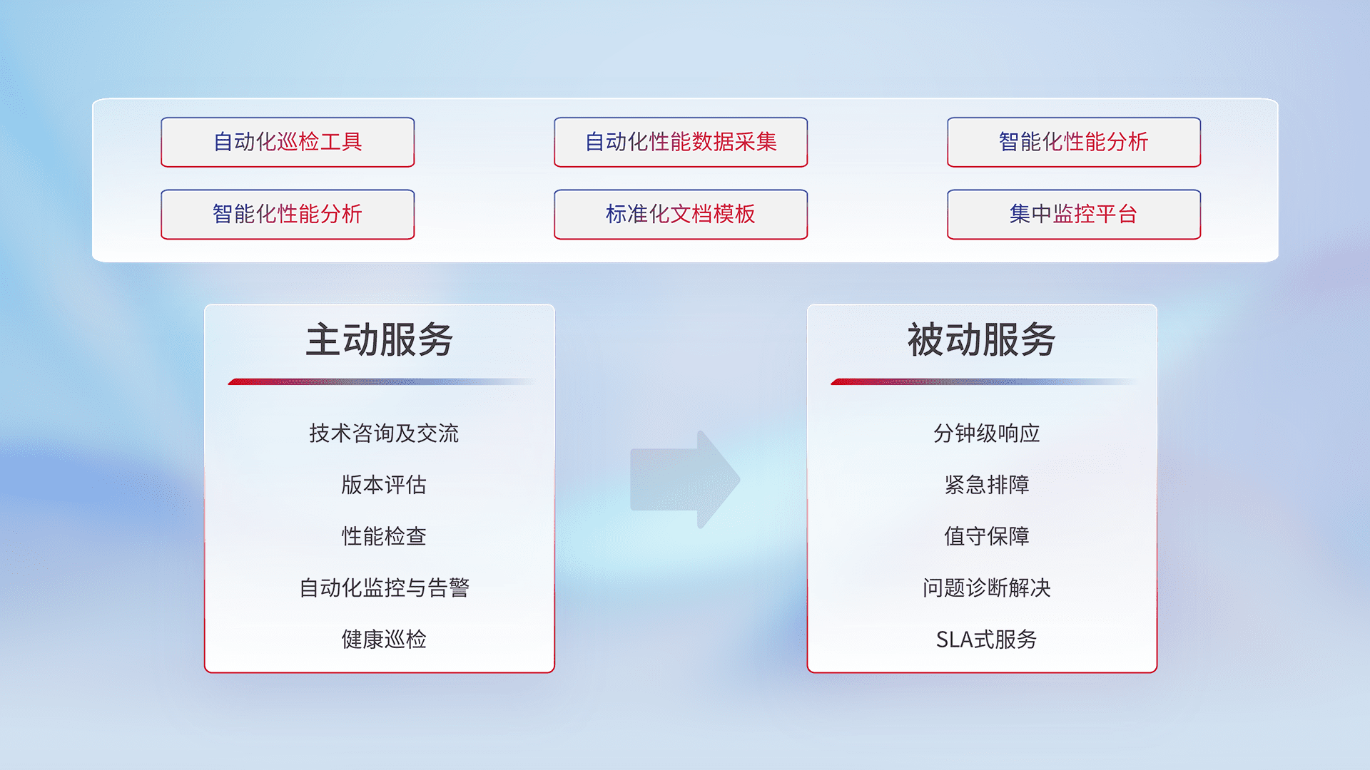 智能化工具和标准化文档,,,,保障服务质量,,,提供主动服务(包含技术咨询、、、版本评估、、、、性能检查、、、、自动化监控与告警、、、健康巡检)和被动服务包含(分钟级响应、、紧急排障、、值守保障、、问题诊断解决、、SLA服务)。。。